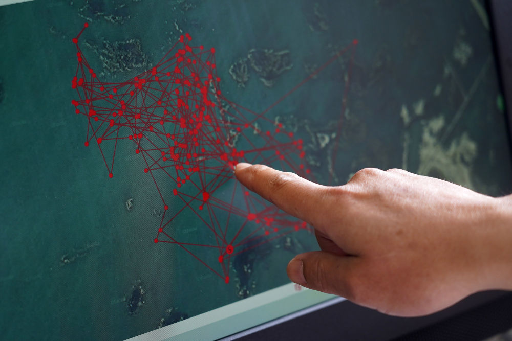 在江西省野生动植物救护繁育中心,汪志如与况绍祥用跟踪系统查看白鹤“爱爱”失联时的信号定位(1月18日摄)。