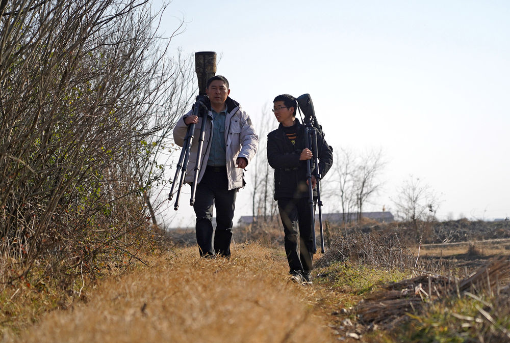 在江西省野生动植物救护繁育中心,汪志如(左)与况绍祥扛着观测设备出发观测白鹤(1月18日摄)。