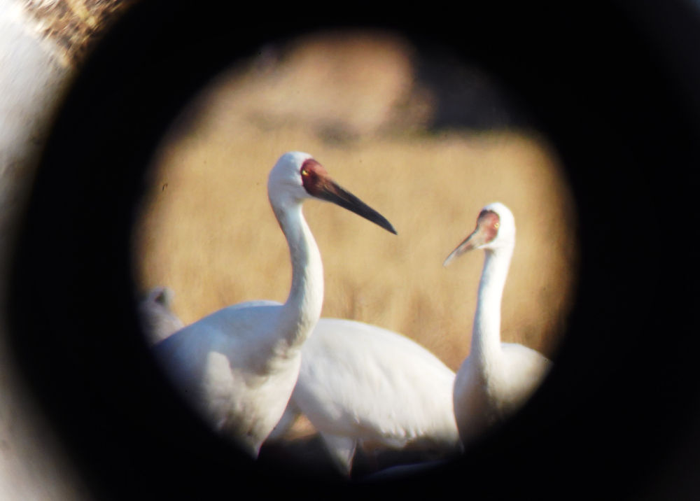 这是1月18日在江西省余干县康山垦殖场拍摄的汪志如望远镜中观测到的白鹤影像。