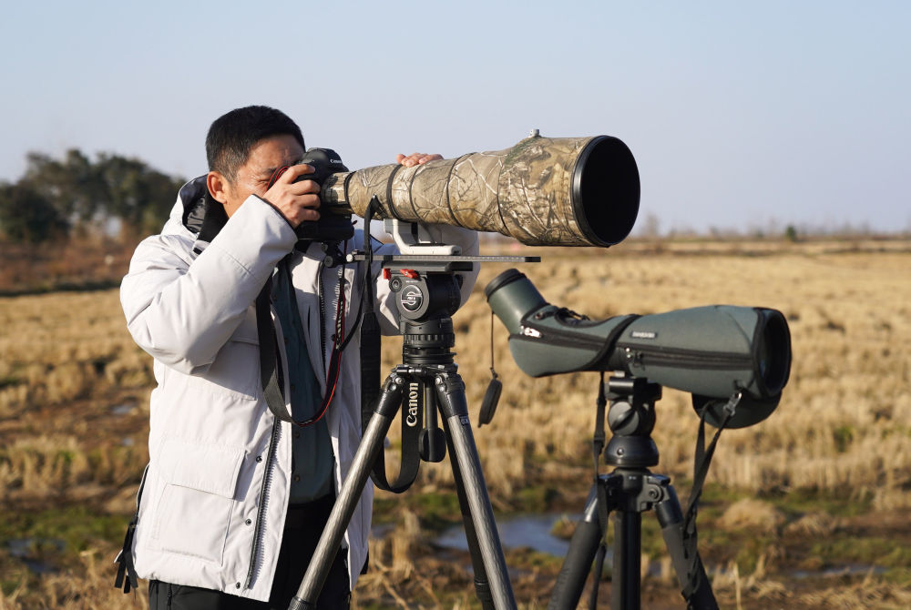 在江西省余干县康山垦殖场,江西省野生动植物救护繁育中心主任汪志如用照相机观测拍摄白鹤(1月18日摄)。