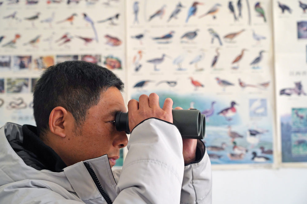 在江西省野生动植物救护繁育中心,汪志如调试望远镜准备出发寻找白鹤“爱爱”(1月18日摄)。