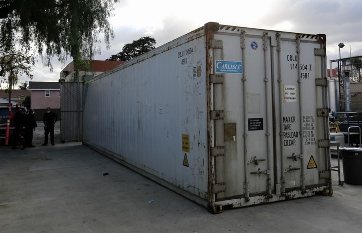 1月22日在美国加利福尼亚州蒙特贝洛市比佛利医院拍摄的停放病人尸体的集装箱。新华社发