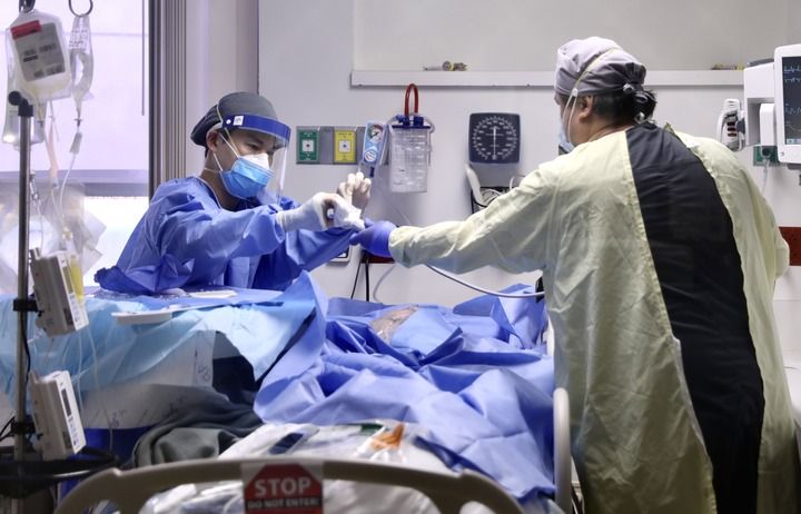 1月22日,在美国加利福尼亚州蒙特贝洛市比佛利医院,医护人员在“新冠病区”的重症监护室忙碌。新华社发