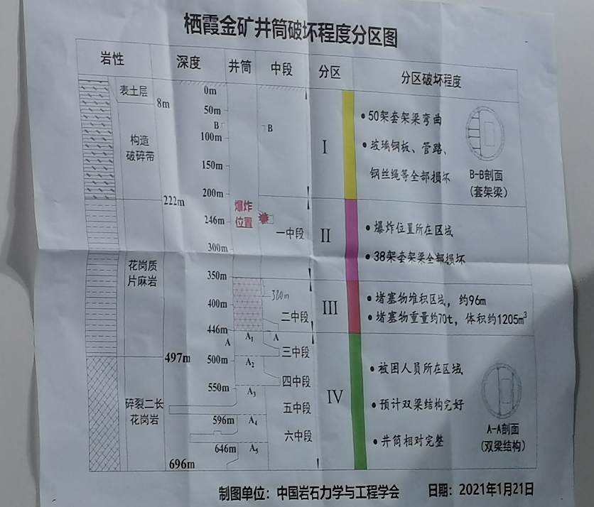 二次爆炸对井筒设施破坏程度更加严重,也使得井筒杂物堵塞更加紧密,给清障工作带来更大困难。从搜寻到的已遇难9名矿工的位置来看,5人在420米左右,4人在三中段(500米)。这说明,这9名矿工都是在一次爆炸后攀爬过程中受二次爆炸冲击遇难的。