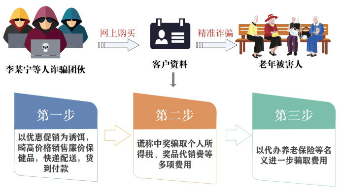 2018年3月至9月,李某宁指使吴某倩等人冒充北京沐某堂健康指导中心主任与老年人沟通联络。过程中套取老年人身体状况等信息,骗得信任后,分步骤实施诈骗。