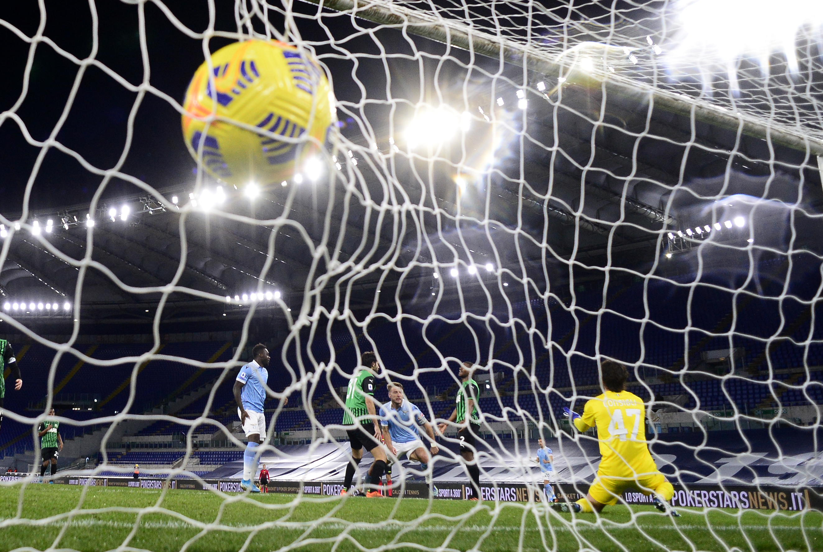 拉齐奥队球员因莫比莱(中)在比赛中射门得分。新华社发(奥古斯托·卡萨索利摄)
