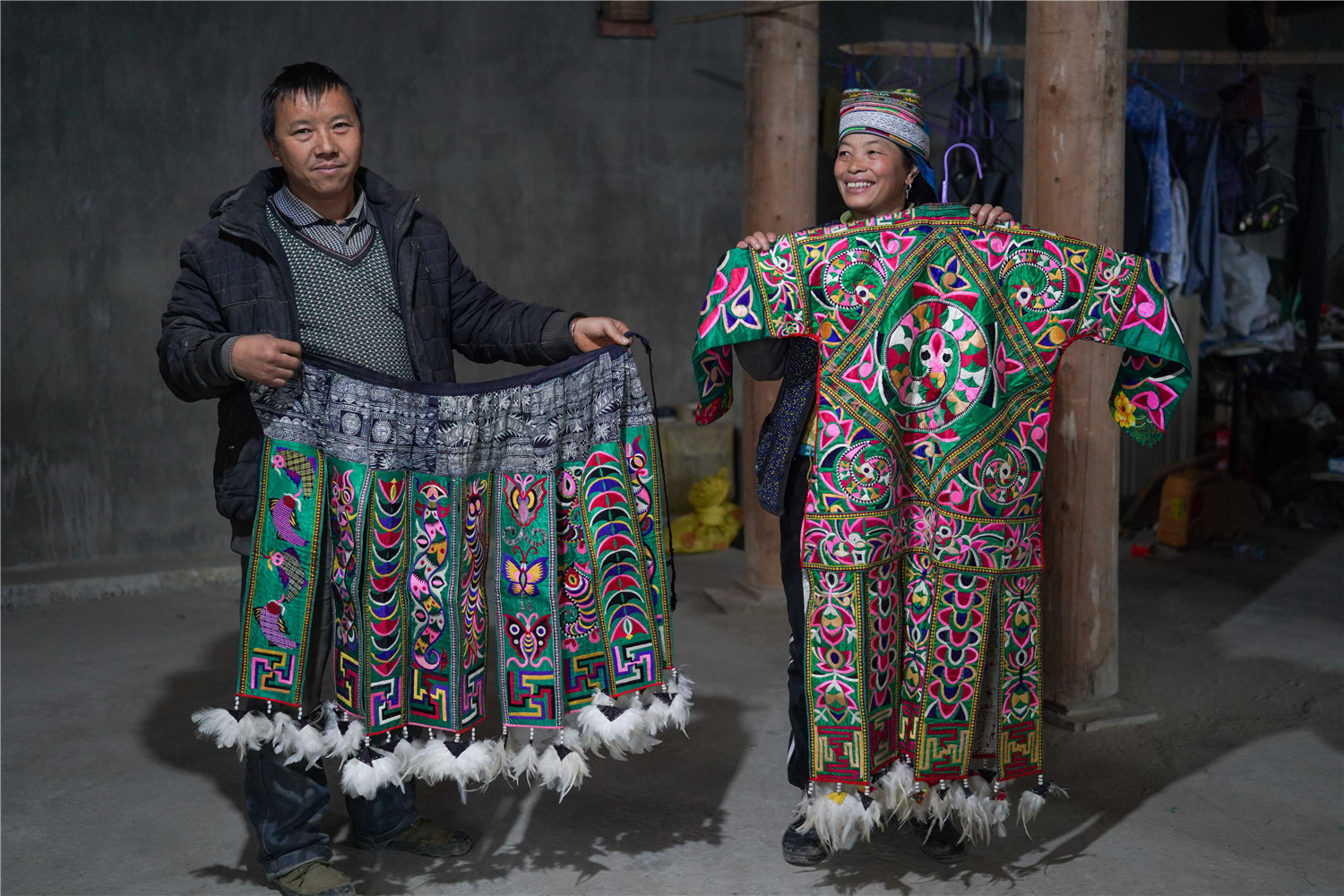 朱守财和妻子潘老拉展示百鸟衣成品(1月7日摄)。新华社发(贺俊怡 摄)