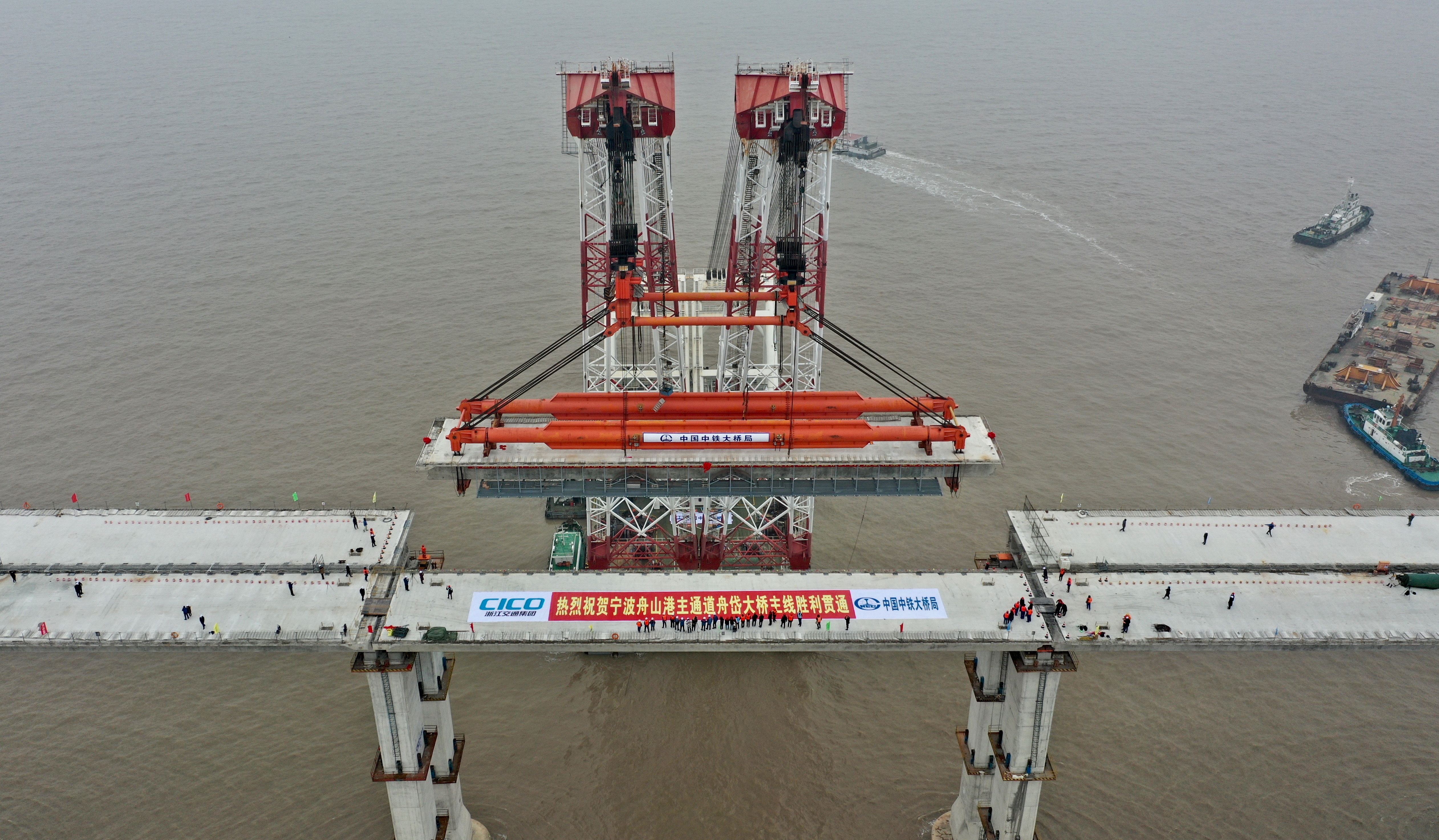1月24日,随着一片重达1800多吨的70米箱梁被海上大型浮吊缓缓地放在舟岱大桥主通航孔北侧跨处的高墩上,宁波舟山港主通道项目实现主线贯通。
