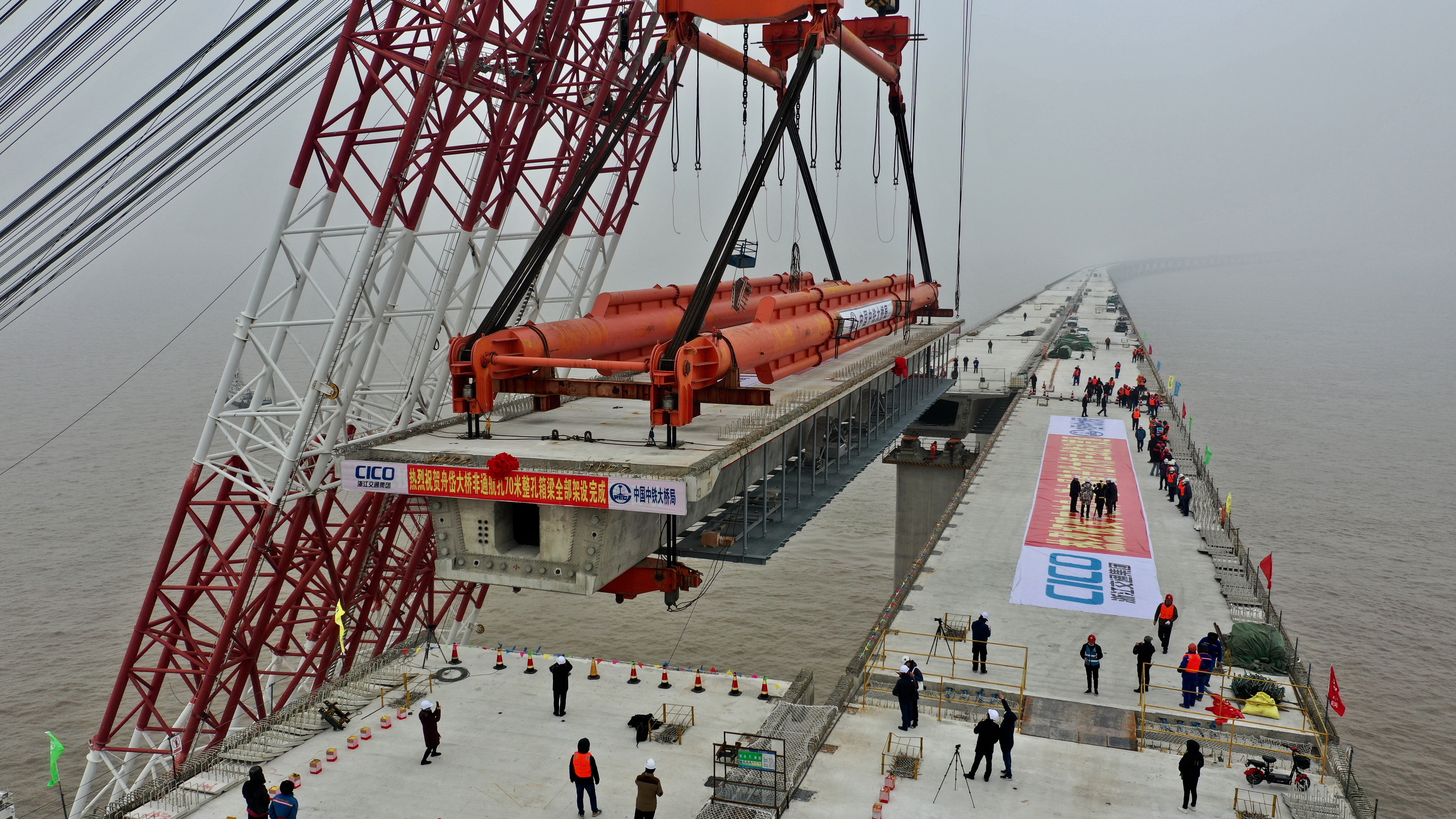 图为最后一片箱梁被放上舟岱大桥。(图片由浙江省交通集团提供)