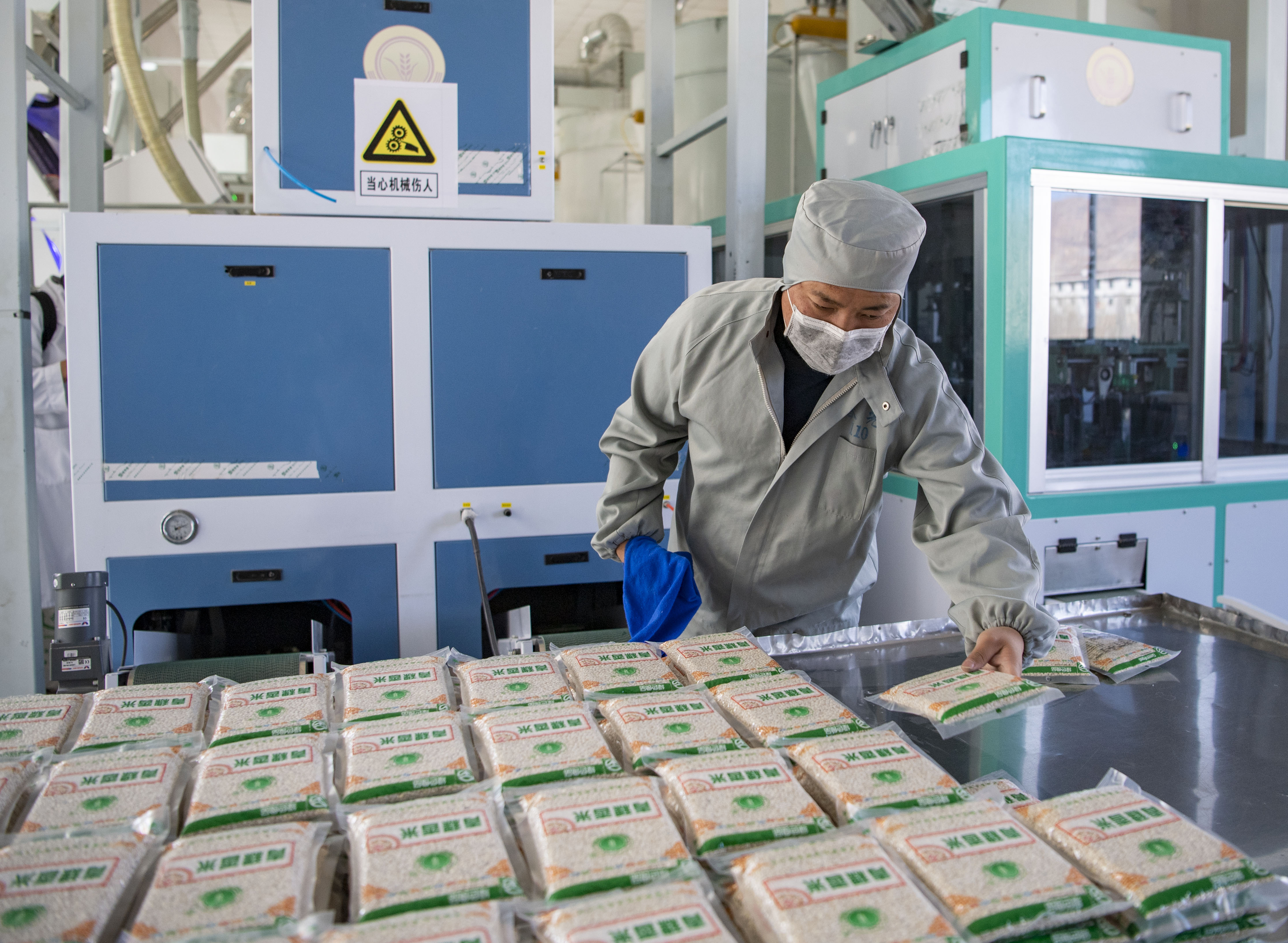西藏拉萨达孜工业园区一家青稞食品生产企业的工作人员在摆放加工好的青稞产品(2020年2月17日摄)。新华社记者 孙非 摄