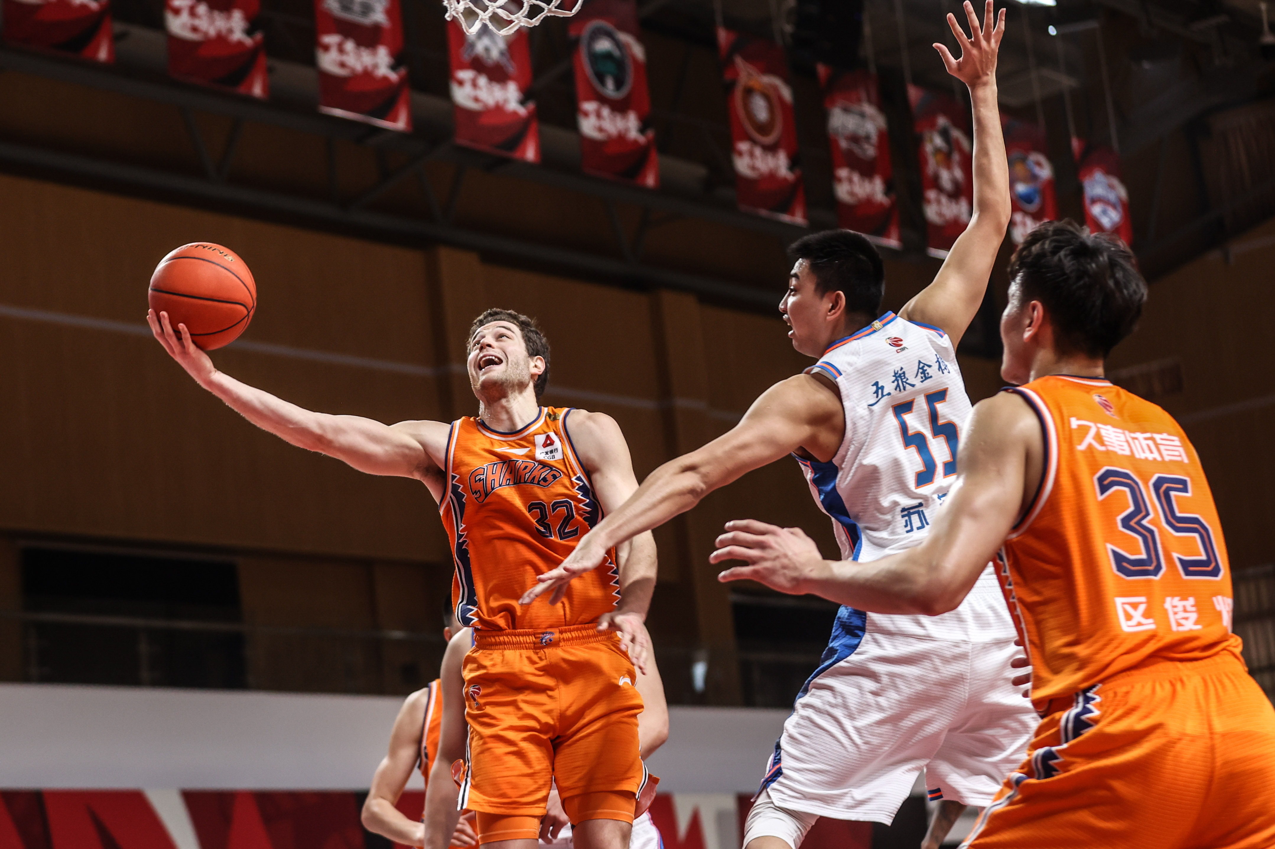 1月25日,上海队球员弗雷戴特(左)在比赛中上篮。新华社记者潘昱龙摄