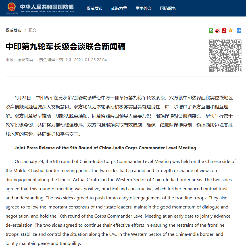 1月24日,中印两军在莫尔多/楚舒勒会晤点中方一侧举行第九轮军长级会谈。双方就中印边界西段实控线地区脱离接触问题坦诚深入交换意见。双方均认为本轮会谈积极务实且具有建设性,进一步增进了双方互信和相互理解。双方同意尽早推动一线部队脱离接触,同意遵照两国领导人重要共识,继续保持对话谈判势头,尽快举行第十轮军长级会谈,共同努力推动降温缓局。双方同意继续采取有效措施,确保一线部队保持克制,稳控西段边境实控线地区的局势,共同维护和平与安宁。