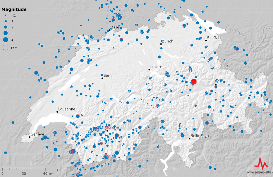 当地时间25日,瑞士地震局发布2020年地震统计数据,去年瑞士及周边地区发生了1400次地震,略高于正常水平,有震感的达到了106次,其中7次地震影响了超过100人。