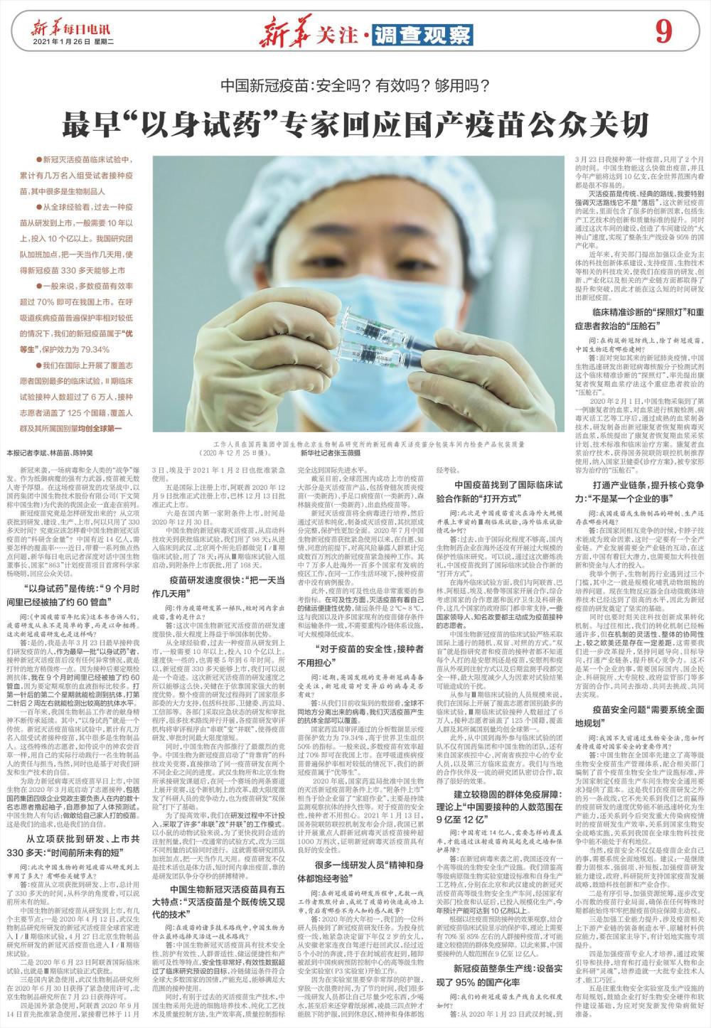 答:是的,我是去年3月23日最早接种我们研发疫苗的人,作为最早一批“以身试药”者,接种新冠灭活疫苗后没有任何异常情况,就是打针的地方稍微疼一点。因为接种后要定期检测抗体,我在9个月时间里已经被抽了约60管血,因为要定期观察的血液指标比较多。打第一针后的第二个星期就能检测到抗体,打第二针后2周左右就能检测出较高的抗体水平。