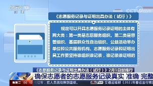 在昨天(25日)民政部例行新闻发布会上,为了确保志愿者的志愿服务记录真实、准确、完整,民政部日前发布了《志愿服务记录与证明出具办法(试行)》,办法实行后志愿服务记录将更加规范,该办法将于2月1日起施行。