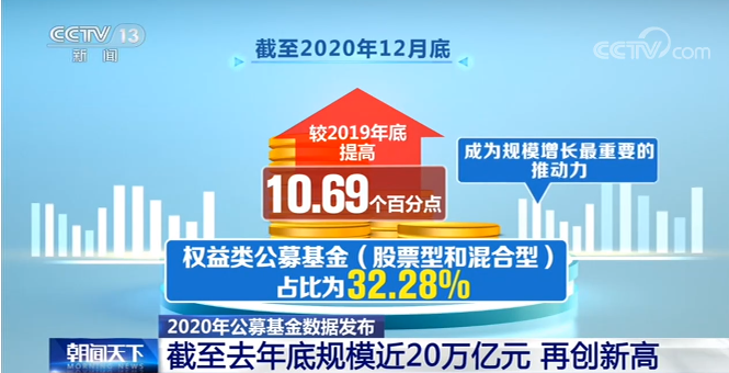 央视网消息:中国证券投资基金业协会昨晚(25日)发布2020年公募基金数据。截至2020年12月底,我国公募基金资产管理规模合计为19.89万亿元,较2019年末增长34.70%。权益类公募基金(股票型和混合型)占比为32.28%,较2019年底提高10.69个百分点,成为规模增长最重要的推动力。