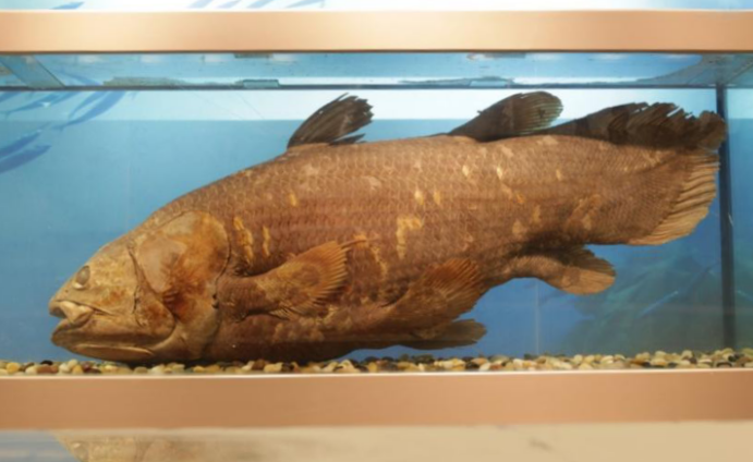 拉蒂迈鱼是4亿年前的总鳍鱼家族残留至今的“活化石”。中国古动物馆展出的这条拉蒂迈鱼标本完好地保存在特制的防腐剂中。从外观来看,它最明显的特点就是拥有肉质肢型的偶鳍。科学家研究发现,拉蒂迈鱼的鱼鳍中含有骨骼,且骨骼结构与四足脊椎动物的四肢非常相像。所以,拉蒂迈鱼为鱼类从水中爬上陆地提供了解剖学上非常重要的证据。至今,它们仍然生活在地球上。