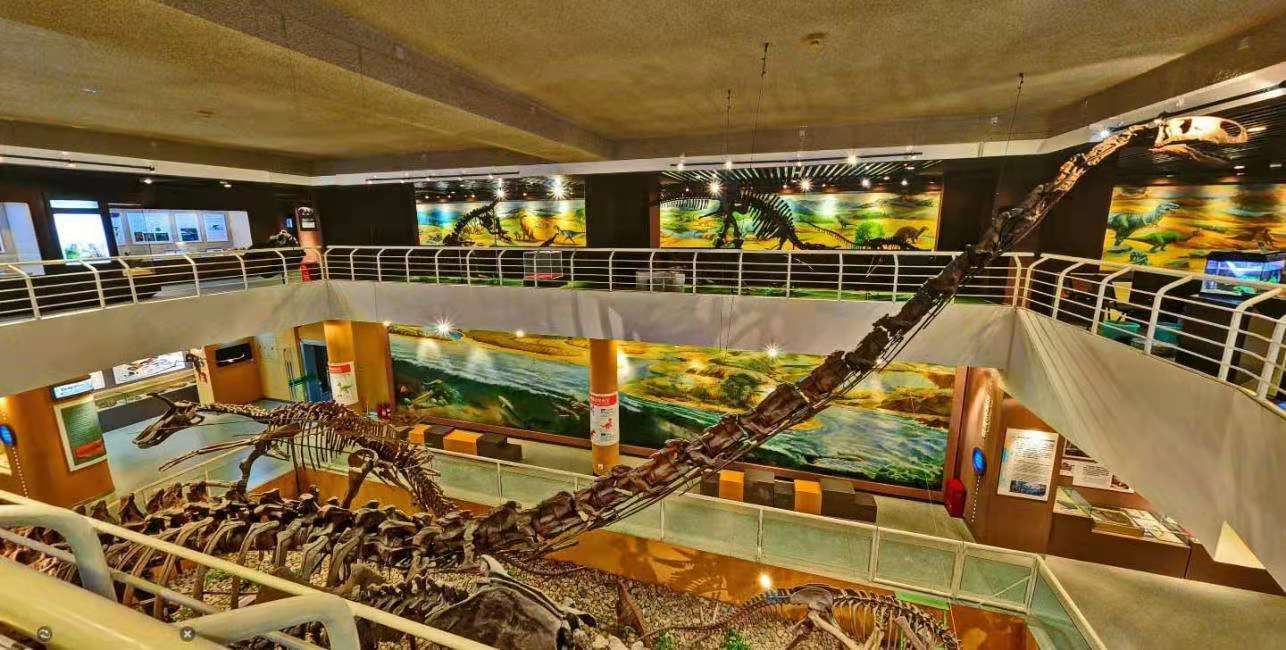 马门溪龙是亚洲个体最大的恐龙之一,也是世界上脖子最长的恐龙。馆内这条合川马门溪龙发现于重庆合川区,它的脖子长度达到了9米,从一楼一直探到了二楼的顶部。这个“大家伙”的腿骨化石高达1.4米,重200公斤,是馆内唯一一个可以亲手触碰的化石标本。科学家们推测,它每天至少要吃300公斤的植物,可谓是恐龙界中温柔的“大吃货”。