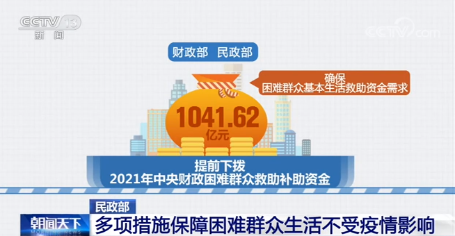 财政部、民政部提前下拨2021年中央财政困难群众救助补助资金1041.62亿元,确保困难群众基本生活救助资金需求。民政部要求各地要及时足额发放低保、特困供养等救助金。另外,各地要针对食品等物价波动情况,启动社会救助和保障标准与物价上涨挂钩联动机制,确保困难群众生活水平不因物价上涨而降低。