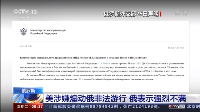 俄罗斯外交部25日在其网站发布声明证实,当天,俄罗斯副外长里亚布科夫就美国大使馆的不当言论向美国驻俄罗斯大使沙利文提出抗议。俄罗斯外交部告知沙利文,俄方认为美方的行为是对俄罗斯内政的直接干涉,告诫美国大使馆应严格遵守俄罗斯法律和国际公认的外交规范。