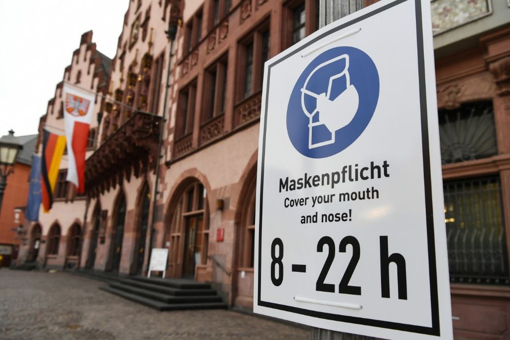 这是1月20日在德国法兰克福罗马广场拍摄的一处提醒人们佩戴口罩的警示牌。(新华社记者逯阳摄)