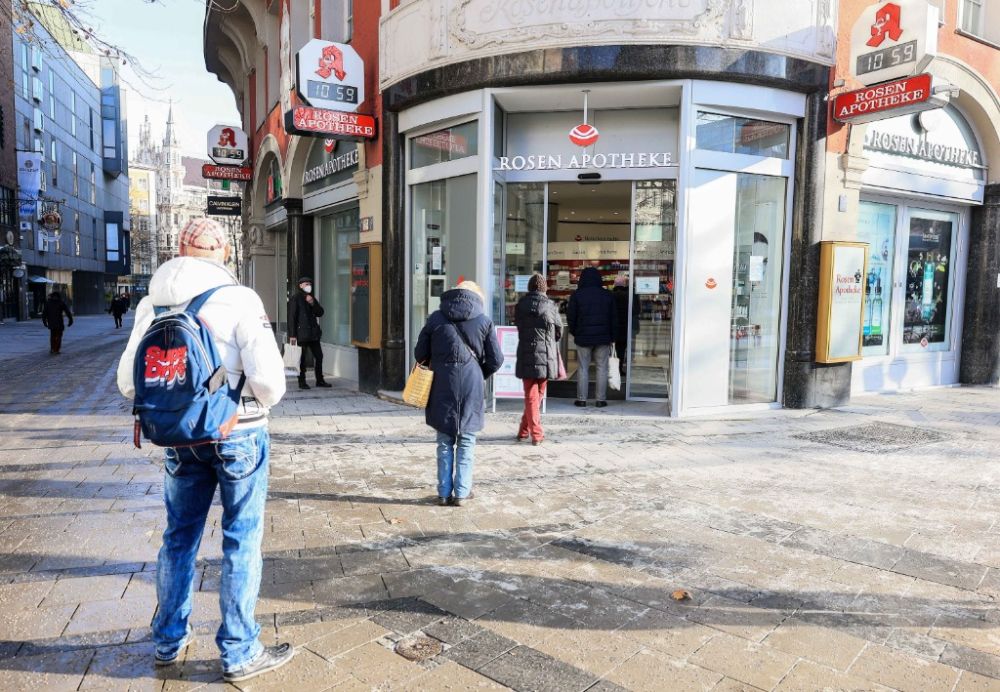 1月15日,在德国慕尼黑,人们排队等候进入一家药店。(新华社发,菲利普·鲁伊兹摄)