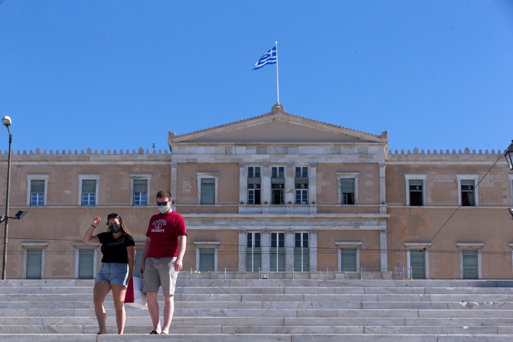2020年10月24日,在希腊雅典,人们佩戴口罩经过宪法广场。(新华社发,马里奥斯·罗洛斯摄)