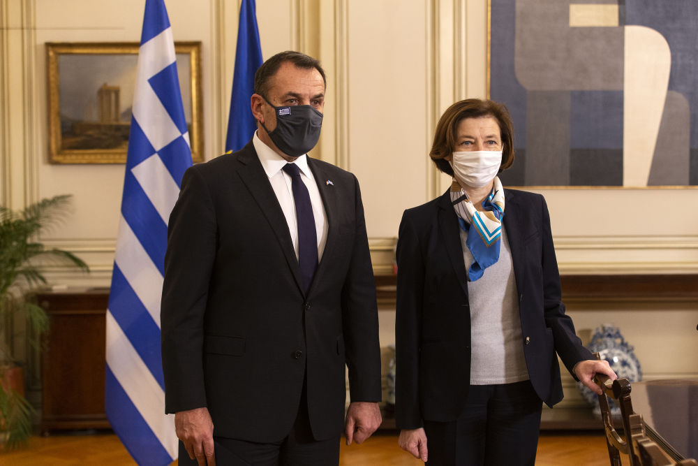 这是1月25日在希腊雅典拍摄的希腊国防部长帕纳约托普洛斯(左)和到访的法国国防部长帕利。新华社发(马里奥斯·罗洛斯摄)