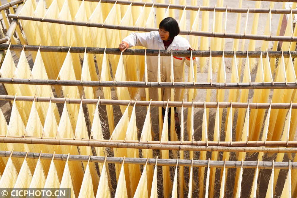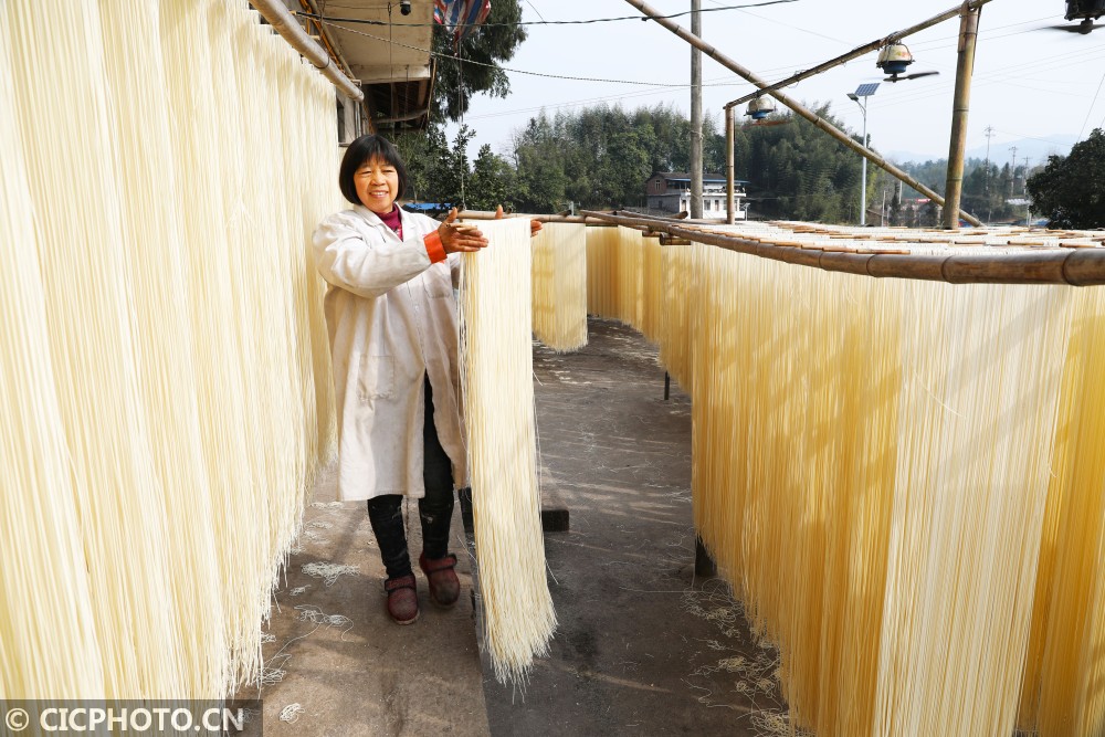 ↑2021年1月23日,重庆梁平区虎城镇千丘村,村民在晾晒手工挂面。CICPHOTO/刘辉 摄