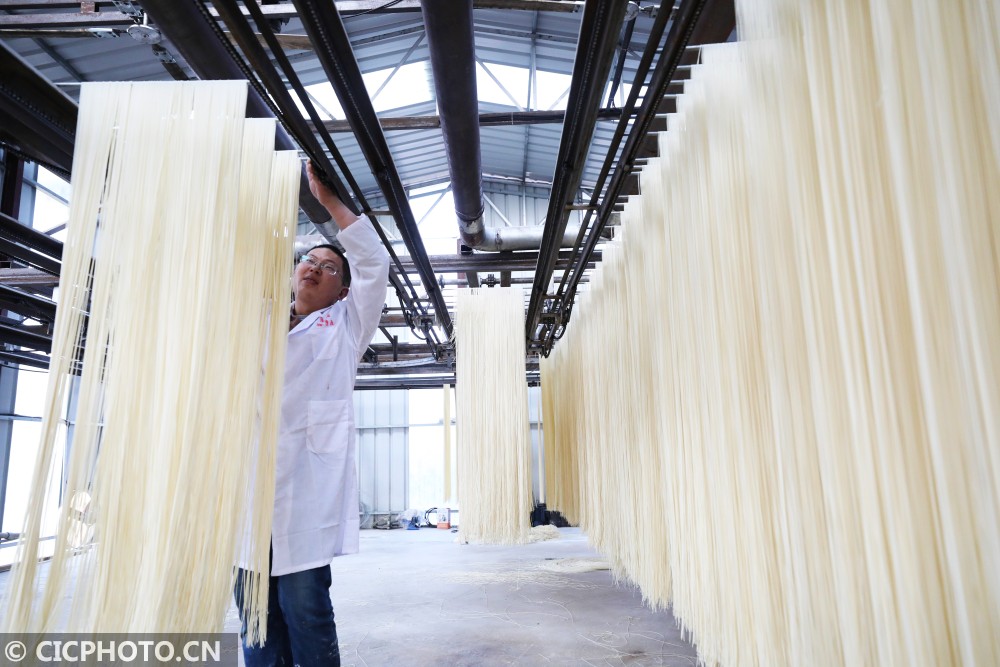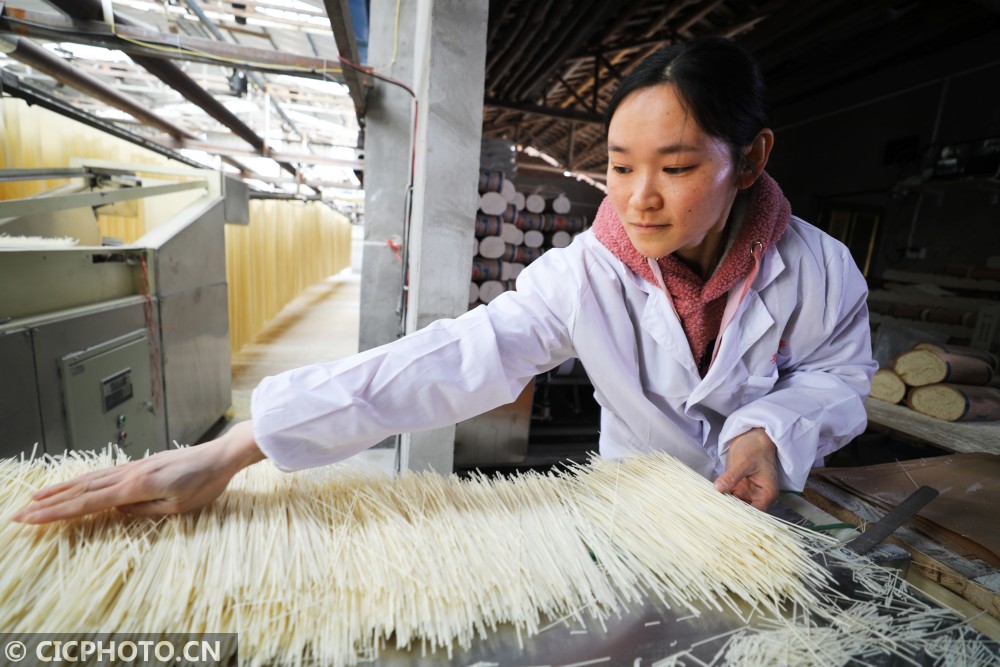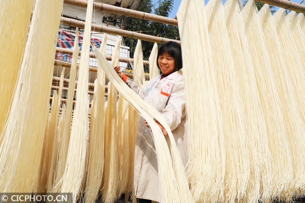 ↑2021年1月23日,重庆梁平区虎城镇千丘村,村民在查看晾晒手工挂面的质量。CICPHOTO/刘辉 摄