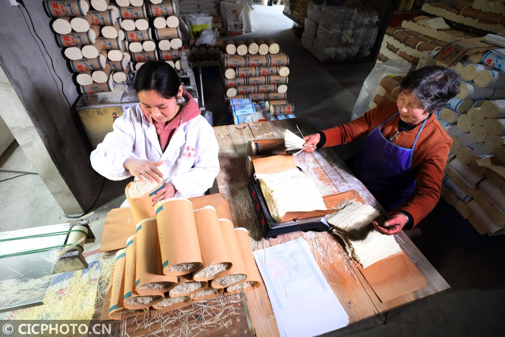 ↑2021年1月23日,重庆梁平区虎城镇千丘村,村民在称重并捆扎手工挂面。CICPHOTO/刘辉 摄