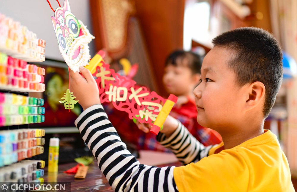 ↑2021年1月23日,内蒙古呼和浩特市新城区光华小学学生在空中主题课上制作创意春联。CICPHOTO/王正 摄