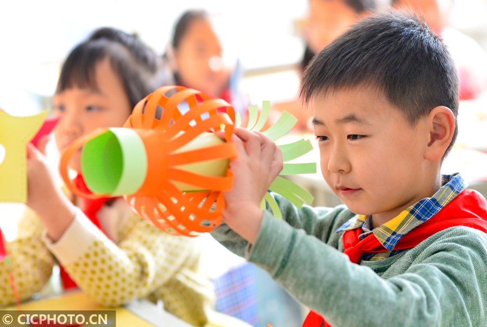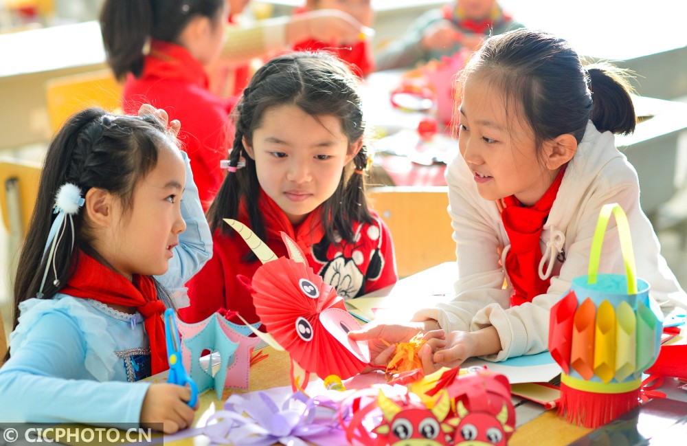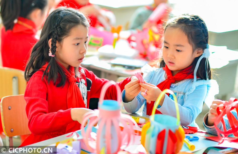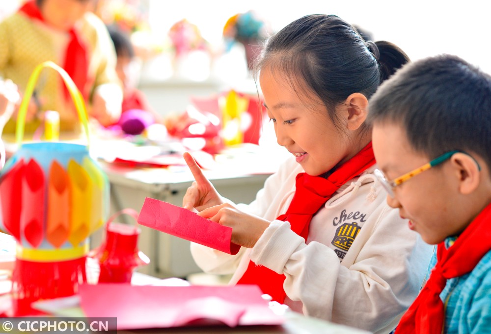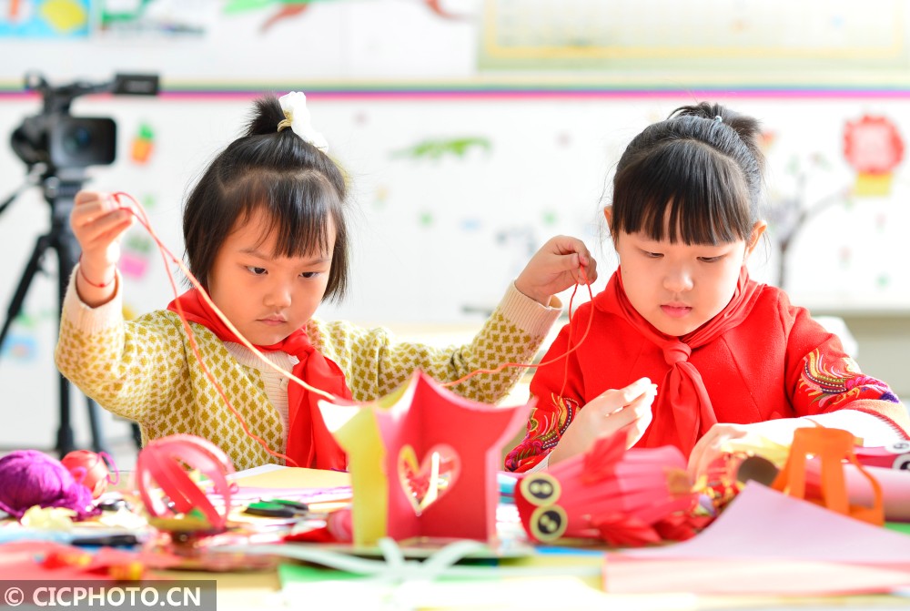 ↑2021年1月23日,内蒙古呼和浩特市新城区光华小学学生在空中主题课上制作创意灯笼。CICPHOTO/王正 摄