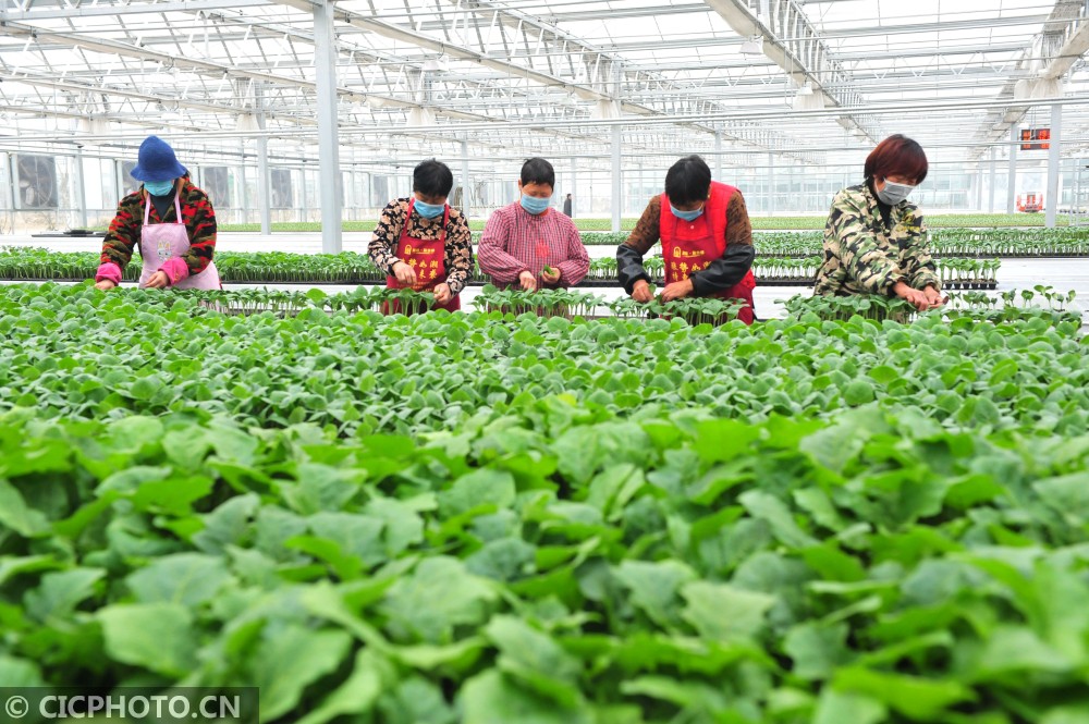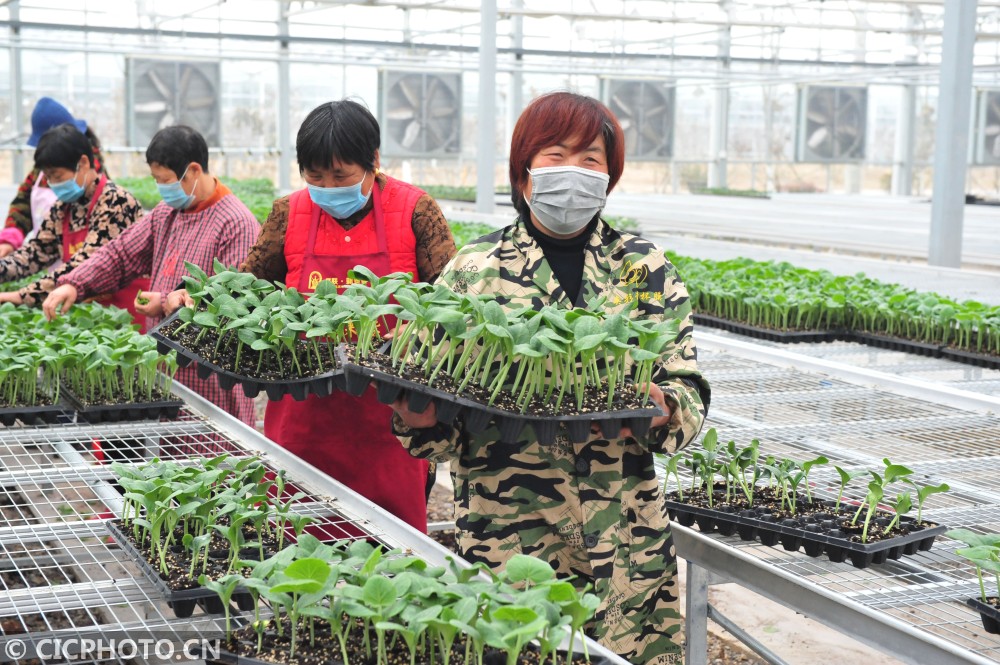↑2021年1月24日,江苏省徐州市睢宁县一农业科技企业的工人在整理瓜苗,准备嫁接。CICPHOTO/洪星 摄