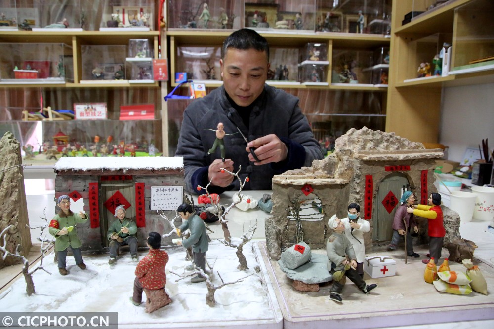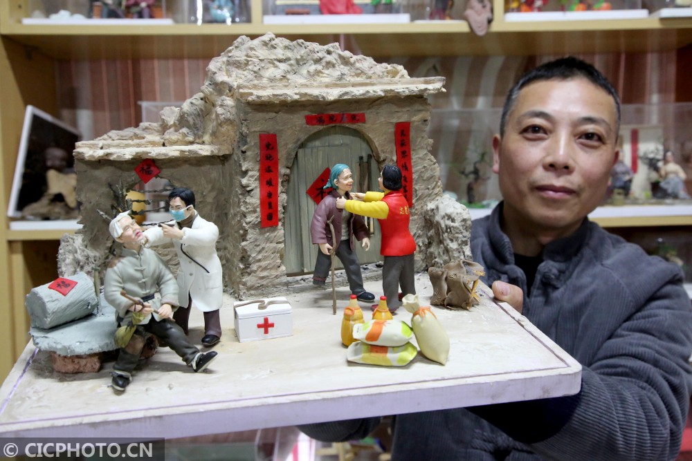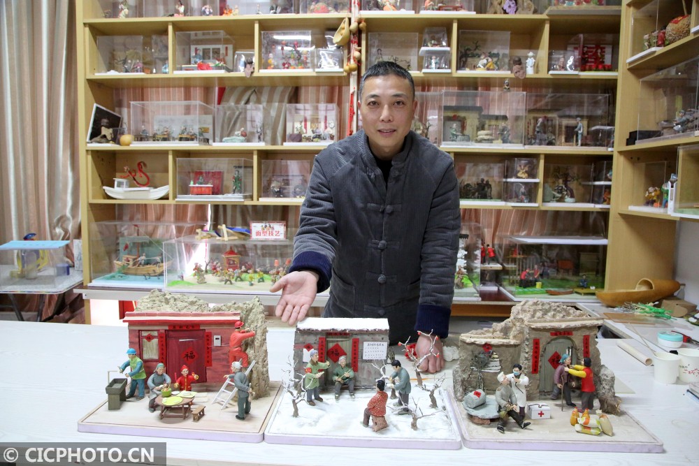 ↑2021年1月25日,江苏省连云港市,孙连东在展示制作的扶贫题材面塑作品。CICPHOTO/邵世新 摄