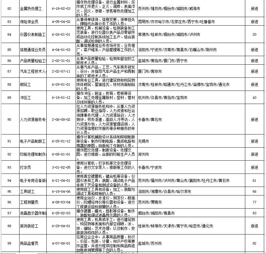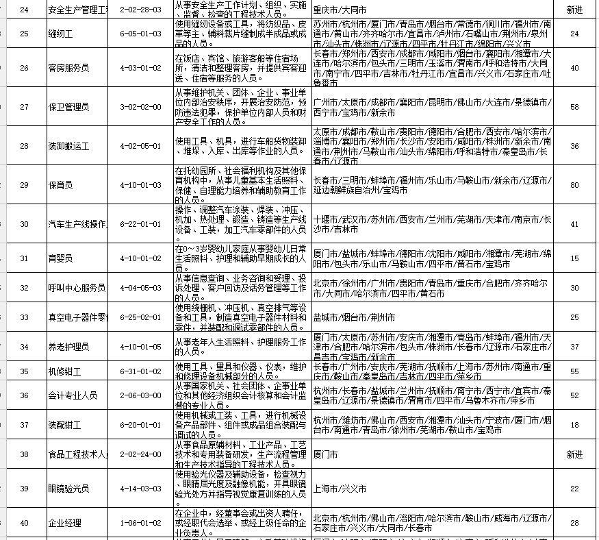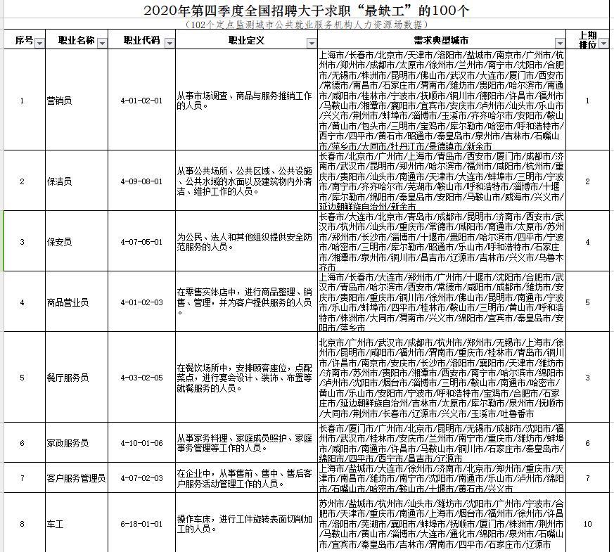 新华社北京1月26日电(记者班娟娟)《经济参考报》记者1月26日从人社部获悉,中国就业培训技术指导中心近期组织102个定点监测城市公共就业服务机构,收集汇总2020年第四季度人力资源市场供求关系较为紧张的招聘、求职需求职业岗位信息,形成“2020年第四季度全国招聘大于求职‘最缺工’的100个职业排行”。
