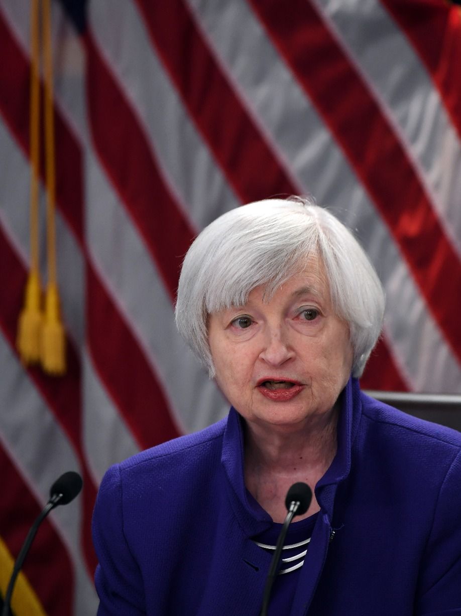2017年12月13日,时任美国联邦储备委员会主席耶伦在华盛顿举行的新闻发布会上讲话。(新华社记者殷博古摄)