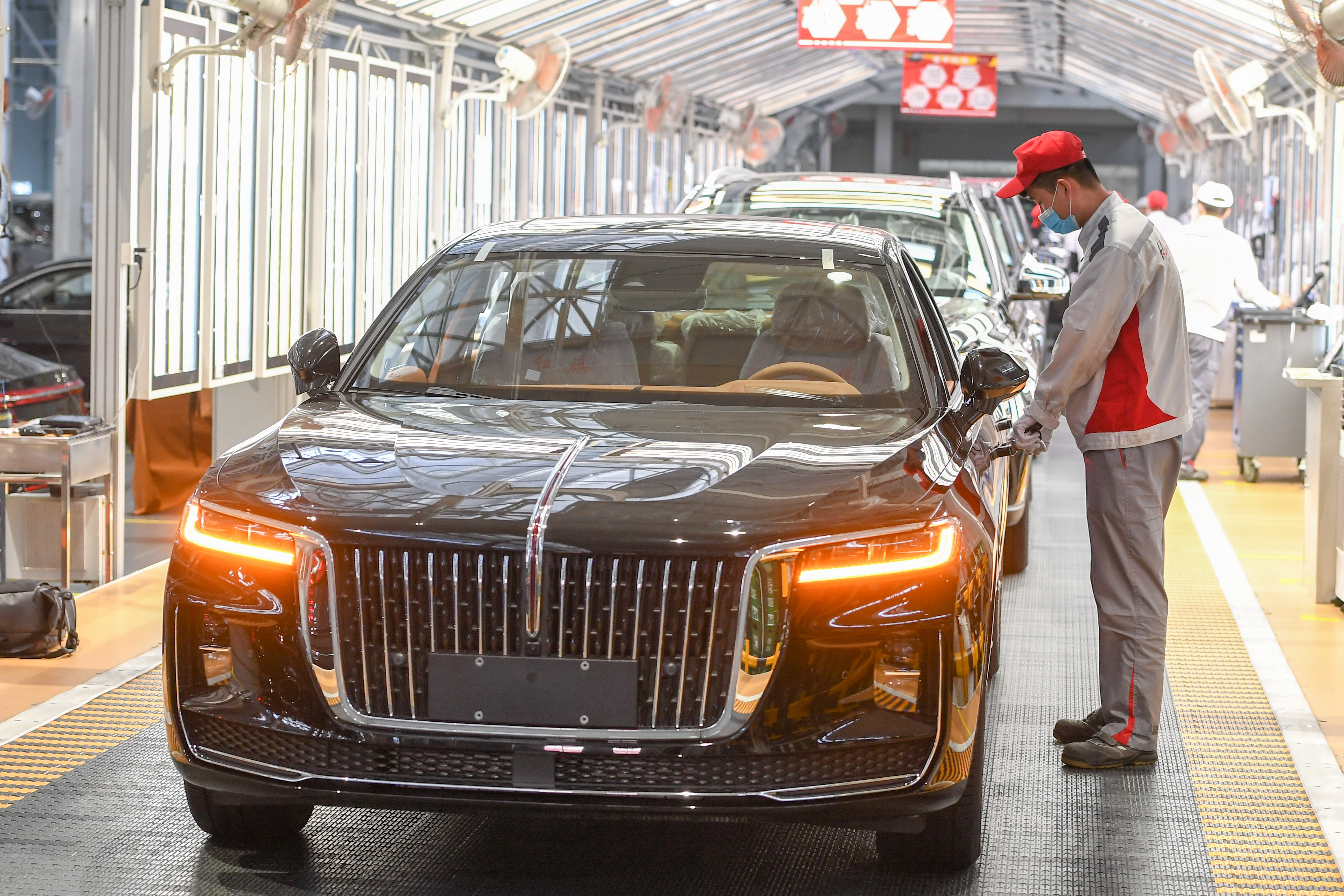 在位于长春的一汽红旗总装车间,工人检查车辆。新华社记者张楠摄