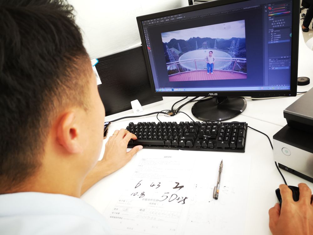 2019年10月10日,工作人员正在修剪访客在“中国天眼”观景台拍的照片。新华社记者 齐健 摄
