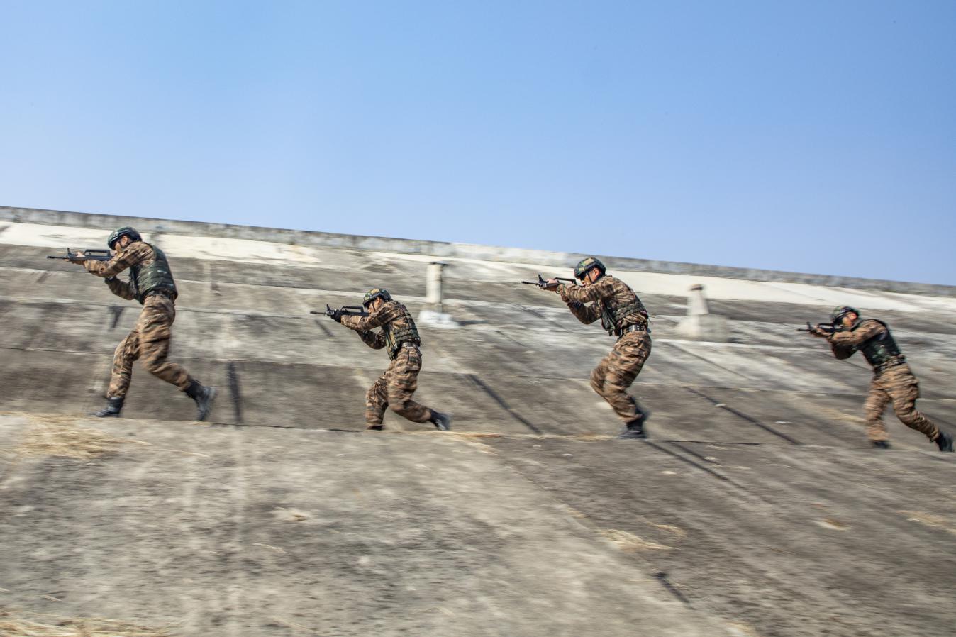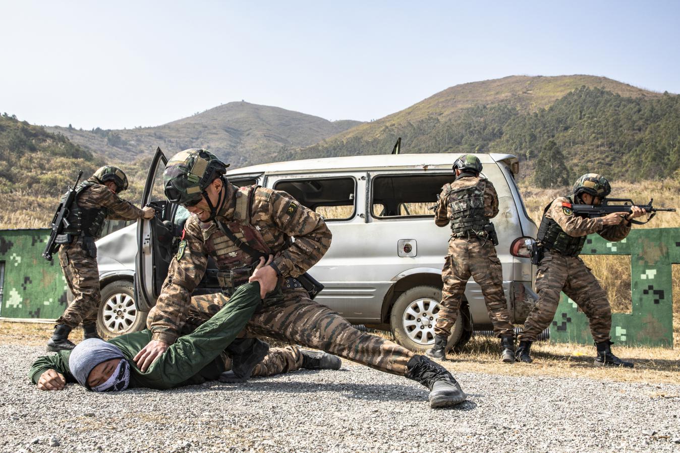 反恐演练中,特战队员搜索追击目标