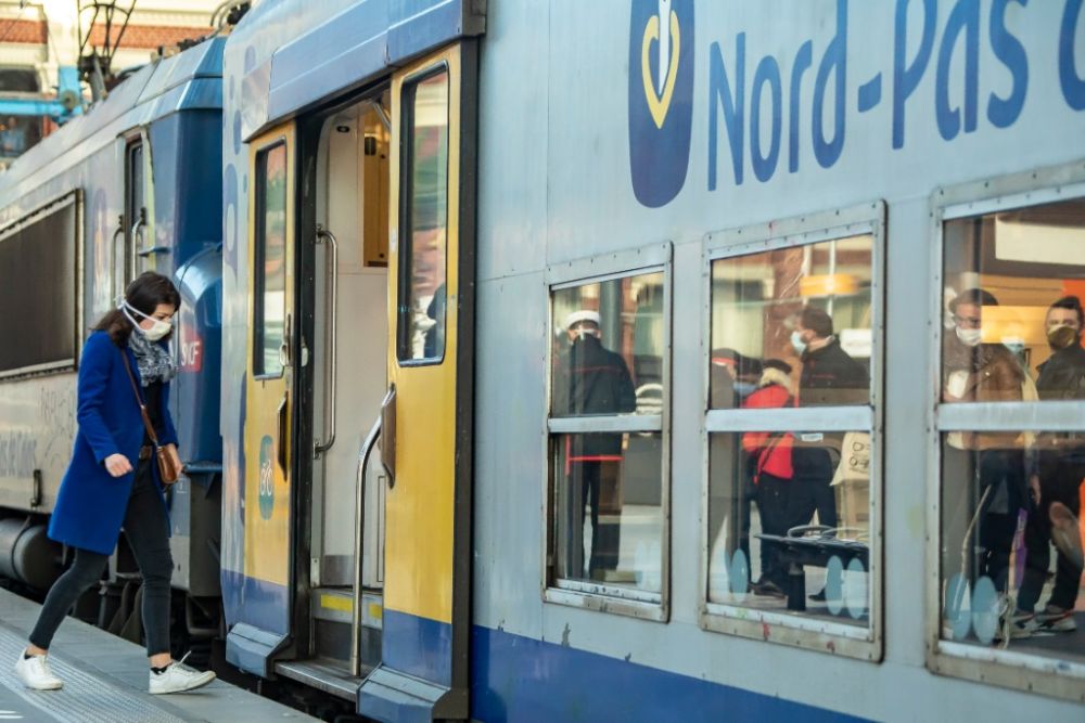 2020年5月14日,在法国北部城市里尔的火车站,戴口罩的乘客走进车厢。(新华社发,塞巴斯蒂安·库尔吉摄)
