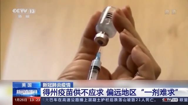 有美国媒体报道指出,当前在新冠疫苗的分发、运输以及接种等环节上,美国多地不同程度上仍存在着问题。据美国哥伦比亚广播公司报道,在得克萨斯州的一些偏远地区,当地有医院直到本月21日才接收到首批新冠疫苗,而这批疫苗总量不足1000剂。