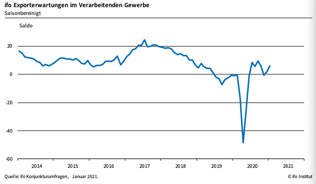 伊弗经济研究所所长克莱门斯·菲斯特当天在一份声明中指出,英国脱欧和美国大选的尘埃落定、强劲的工业复苏以及全球范围内新冠疫苗接种工作的展开有效缓解了德国出口行业的悲观情绪。