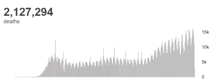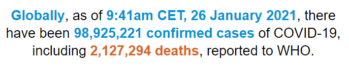 根据世卫组织最新实时统计数据,截至欧洲中部时间1月26日9时41分(北京时间1月26日16时41分),全球累计新冠肺炎确诊病例98925221例,累计死亡病例2127294例。