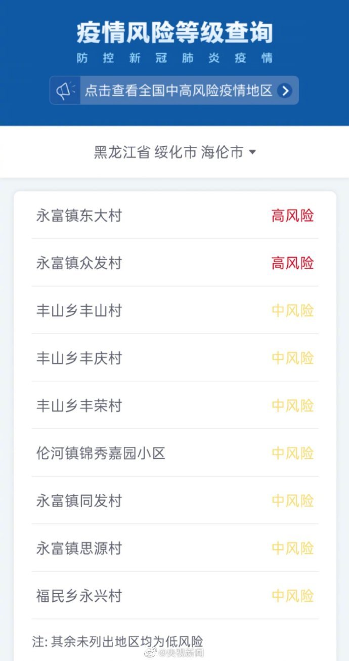 1月25日,黑龙江海伦市发布消息:将海伦市永富镇东大村、永富镇众发村调整为高风险区;永富镇思源村、同发村,丰山乡丰庆村、丰山村、丰荣村,福民乡永兴村,伦河镇锦绣嘉园小区等地调整为中风险区。
