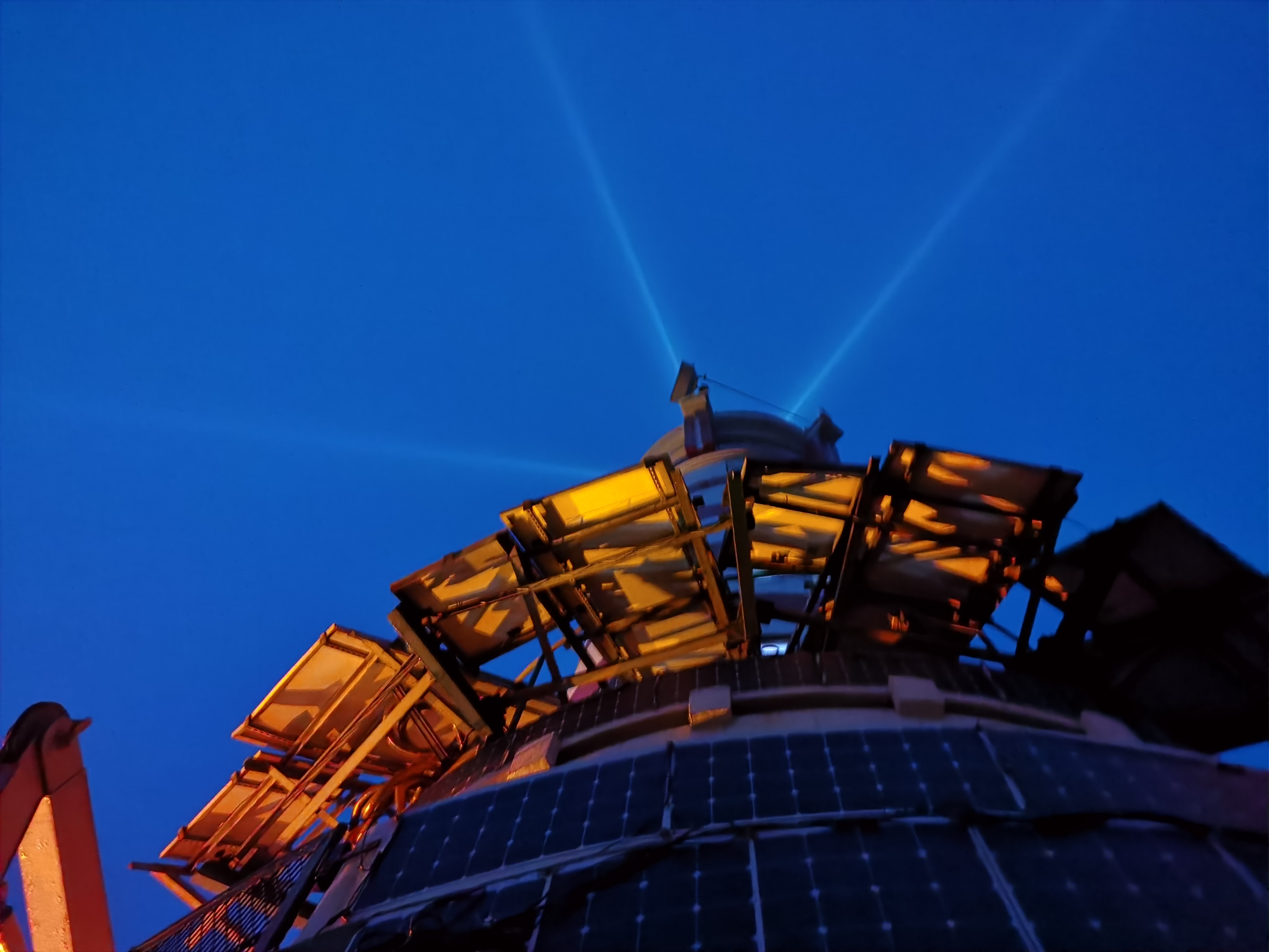 夜幕降临,天津港附近海域风平浪静,海天一色。随着最后一抹夕阳消失在海平面下,一束明亮的光柱从大沽灯塔的灯笼中射出,倏然穿透了暮霭的静谧。