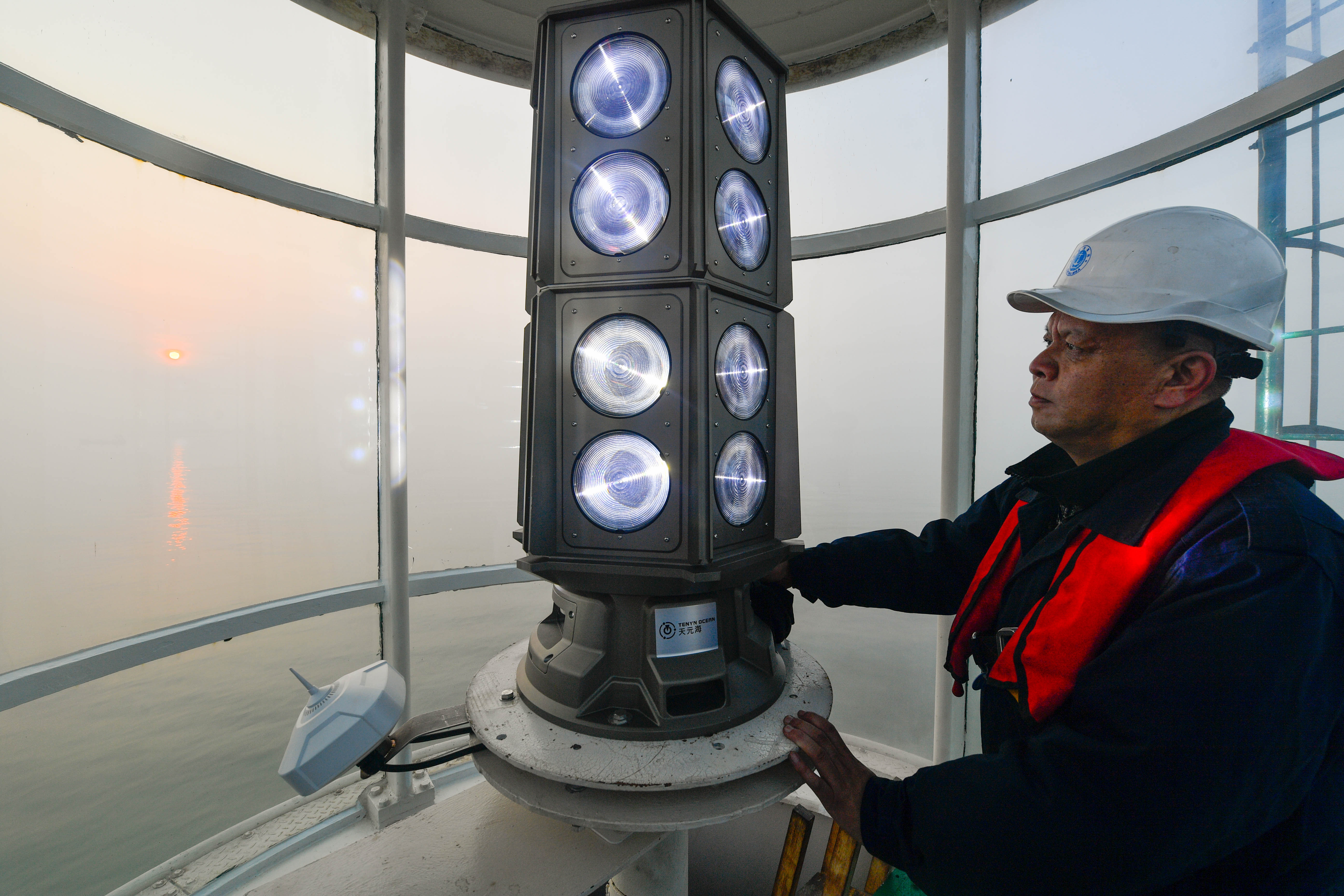 今年47岁的天津港航标管理站海上班班长李红旗再次站在大沽灯塔11层的灯器旁,静静望向下方的船舶。对他来说,这样的守候已成习惯。