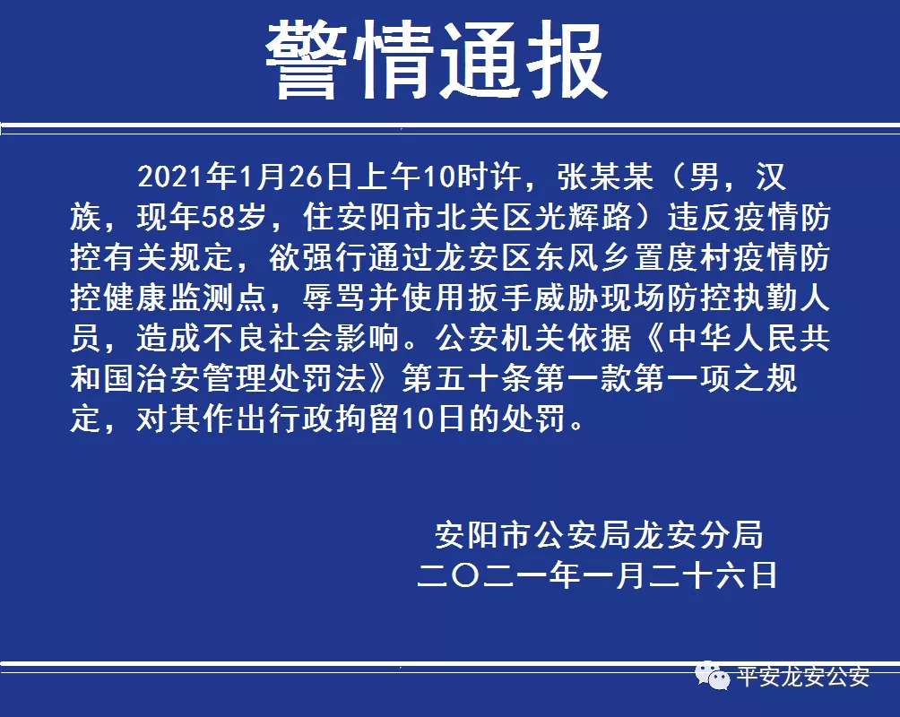 当天下午河南省安阳市公安局龙安分局发布警情通报,全文如下:2021年1月26日上午10时许,张某某(男,汉族,现年58岁,住安阳市北关区光辉路)违反疫情防控有关规定,欲强行通过龙安区东风乡置度村疫情防控健康监测点,辱骂并使用扳手威胁现场防控执勤人员,造成不良社会影响。公安机关依据《中华人民共和国治安管理处罚法》第五十条第一款第一项之规定,对其作出行政拘留10日的处罚。