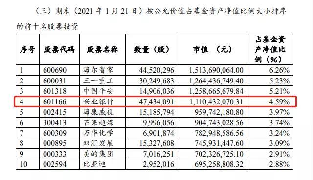 1月25日,由谢治宇管理的兴全合润混合型证券投资基金发布上市交易公告书。公告书显示,谢治宇在1月大幅加仓兴业银行,截至1月21日,兴业银行新进兴全合润前十大重仓股,位列第四,占基金资产净值比例为4.59%。