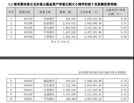 例如混合型基金“金信智能中国2025”并非银行主题类基金,但是2020年四季度末的十大重仓股均为银行股,前十大重仓股占基金资产净值比例为66.09%。